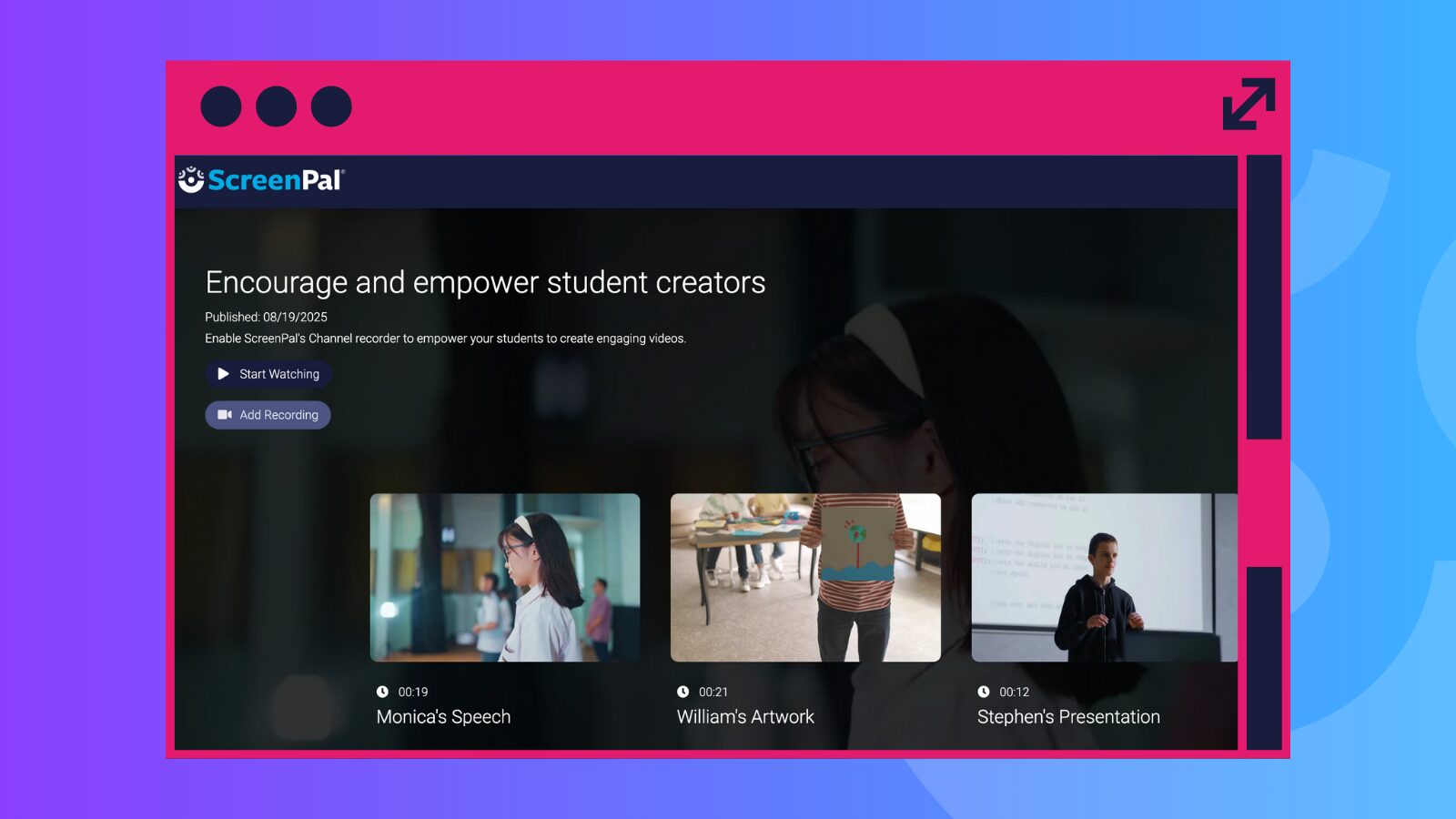 The online Channel Recorder allows students to easily create and submit videos directly within your ScreenPal channel, no account sign-in required. It’s a secure, streamlined way to gather student-created content for projects, presentations, and reflections across all subjects.