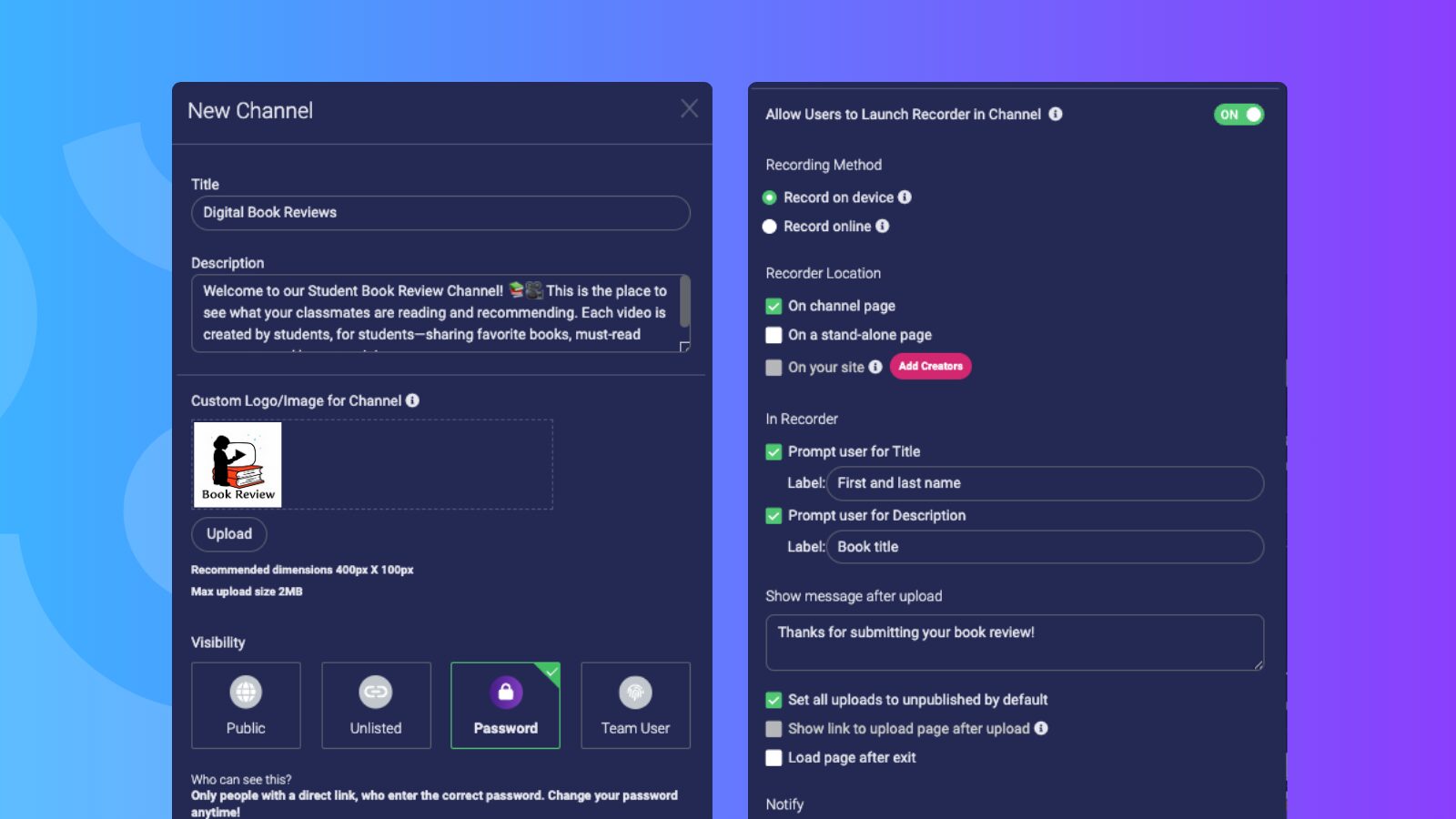 Before your students can start sharing their creations with the Channel Recorder, you’ll need to set up a Channel where all their videos can be collected in one place. Here’s how to create a streamlined, student-friendly recording space: