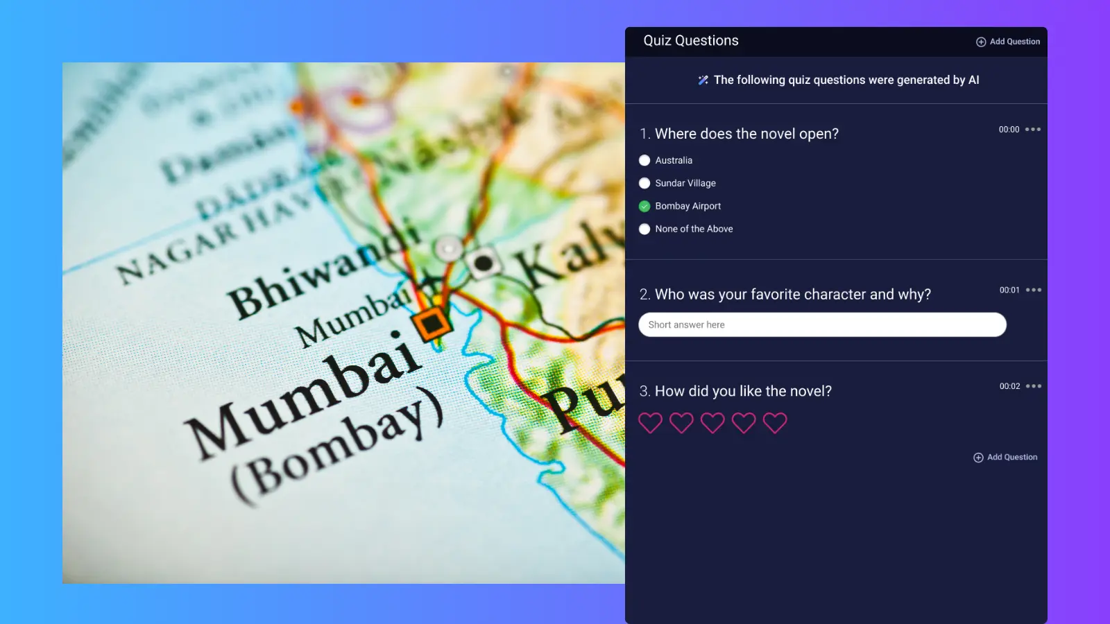 - Create a new quiz from your video. You can add questions and answers manually, or save time by starting with AI questions auto-generated from your video content.